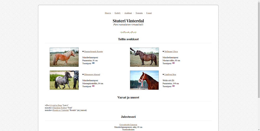 Kaikki Stuteri Vinterdalin sivuilla on tallin omistaja JP:n käsialaa, ellei toisin mainita. Ponien kuvien tekijänoikeudet saat näkyviin klikkaamalla kuvaa suuremmaksi - tällöin kuvaajan nimi tulee esille suurennetun kuvan alapuolelle. Kaikki tekstit ovat JP:n kirjoittamia, ellei esim. valmennustekstien yhteydessä mainita toisin.
